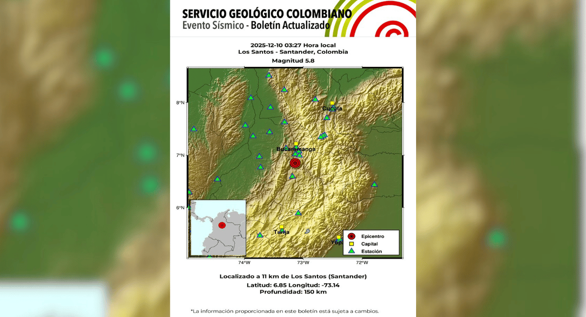 El movimiento telúrico tuvo como epicentro la zona de La Mesa de Los Santos, en Santander —una de las regiones con mayor actividad sísmica del país— y alcanzó una profundidad cercana a los 150 kilómetros. Esa combinación permitió que el temblor se percibiera con fuerza en un amplio sector del territorio nacional.