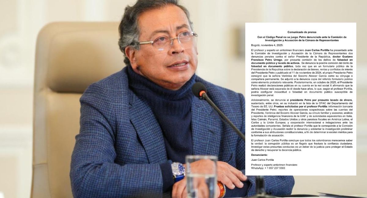 El día de hoy se conoció que el profesor y experto en finanzas criminales Juan Carlos Portilla radicó ante la Comisión de Investigación y Acusación de la Cámara de Representantes dos denuncias penales contra el presidente Gustavo Petro por presunta falsedad en documento público y lavado de activos.