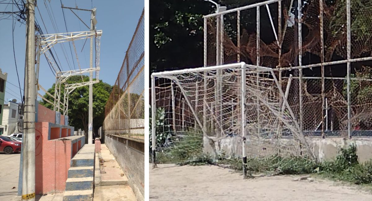 En el corregimiento de Taganga, la cancha Juan Garcés, desde hace meses se encuentra sin techos en las graderías, con maleza en su interior y con un evidente deterioro de su malla.
