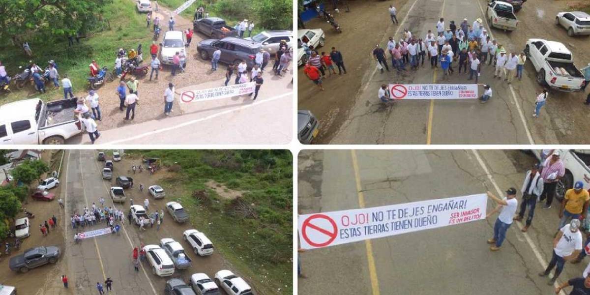 Terratenientes de la verada Los Chivos, en el municipio magdalenense de Plato, salieron a la principal vía de comunicación de esa población armados de pendones y diferentes pasacalles para denunciar que sus tierras productivas, utilizadas para la ganadería y agricultura, pretenden ser invadidas supuestamante por invasores profesionales.